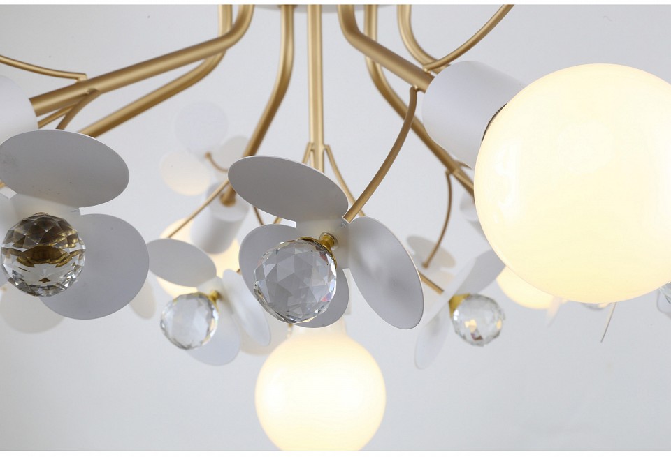 Металлический каркас белого цвета с золотыми элементами, декор в виде хрустальных шаров, круглые плафоны из непрозрачного стекла, сменные лампы. Коллекция Lassie выполнена в стиле современной флористики. Светильники декорированы лепестками белого цвета из металла, сердцевина цветка выполнена из прозрачного хрусталя, а стебли растений окрашены в цвет золота. Коллекция состоит из потолочной люстры и настенного светильника