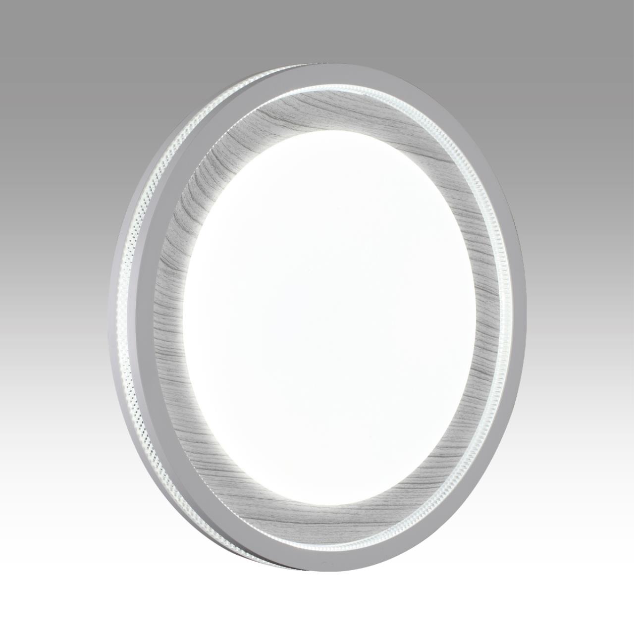 Светильник 7681/EL линии MAVI WOOD состоит из металлического основания (базы) и пластикового рассеивателя. Материал рассеивателя — высококачественный пластик марки PMMA 2.0 белого цвета с матовой поверхностью, без текстуры. Пластик обеспечивает светильнику равномерное рассеивание и хорошее светопропускание. Форма плафона: круглая, декорирована ободом из пластика светло-серого цвета под дерево с прозрачной вставкой под хрусталь. Степень защиты IP43 позволяет использовать светильник в определенных зонах влажных помещений. В комплект входит заменяемый LED-модуль с линзами мощностью 70 Вт, соответствующей лампе накаливания 610 Вт, а также пульт ДУ (с креплением на стену), с помощью которого осуществляется плавное изменение цветовой температуры в диапазоне 3000—6000 К, изменение яркости, переход в режим переключения теплого/белого/холодного/ночного света. Светильник имеет функцию памяти.