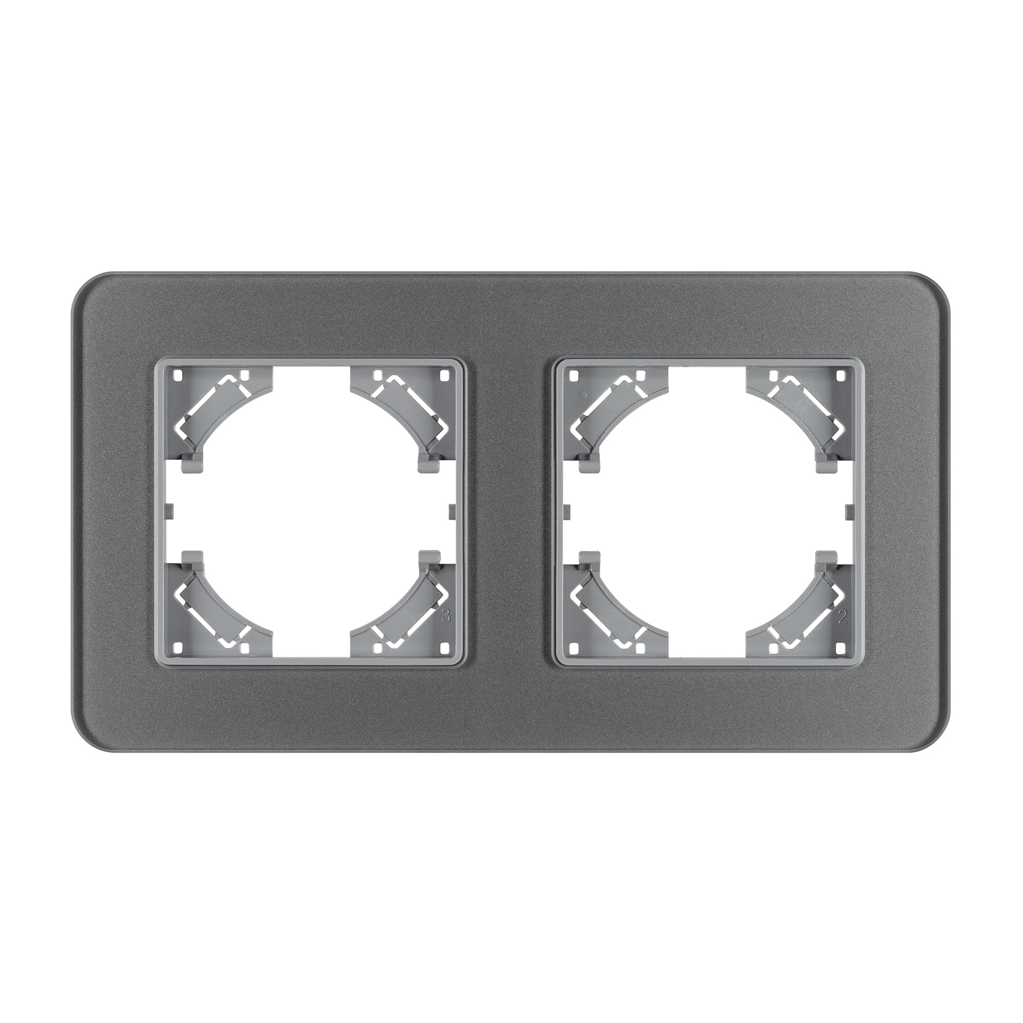 Рамка стеклянная на 2 поста, под встраиваемый механизм. Цвет - серый. Среднего уровня герметичности IP20. Ориентация монтажа - горизонтальная (основным ориентиром служат посадочные выступы для накладки механизма).