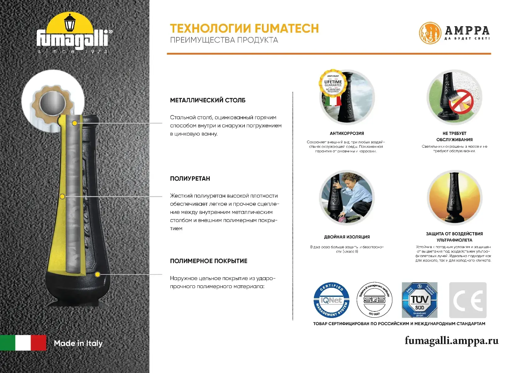 | Комплектация | С светодиодной лампой "FUMAGALLI" E27, 4000K. Специально для улицы, яркость 5000Lm. С защитой от перепадов температуры, повышенной влажности и скачков напряжения. |